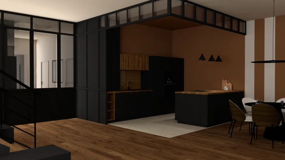 La réflexion s'est portée sur la restructuration des espaces et la mise en valeur des volumes, afin d’optimiser les usages et la circulation au sein de l’appartement. Le travail des matériaux bruts (métal, bois, finitions minérales) dialogue avec des éléments plus doux et enveloppants, contribuant à l’équilibre entre caractère industriel et bien-être.