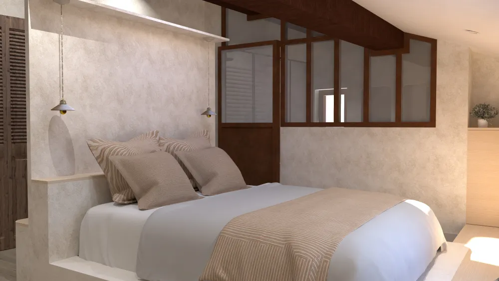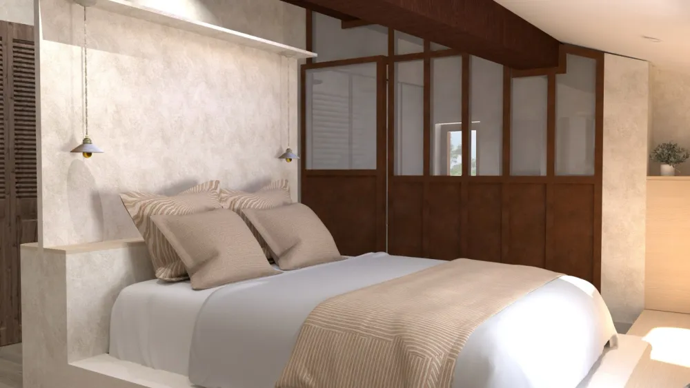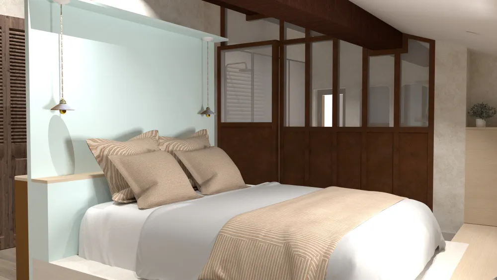 >> Le projet "Sous les toits" avait pour objectif de transformer un niveau sous combles jusqu’alors inexploité en un véritable espace parental. Cette création permettra de libérer et de réorganiser les espaces existants afin de mieux répondre aux besoins d’une famille avec trois enfants. L'ancien espace chambre parentale pourra désormais accueilir un espace chambre d'ami/buanderie.